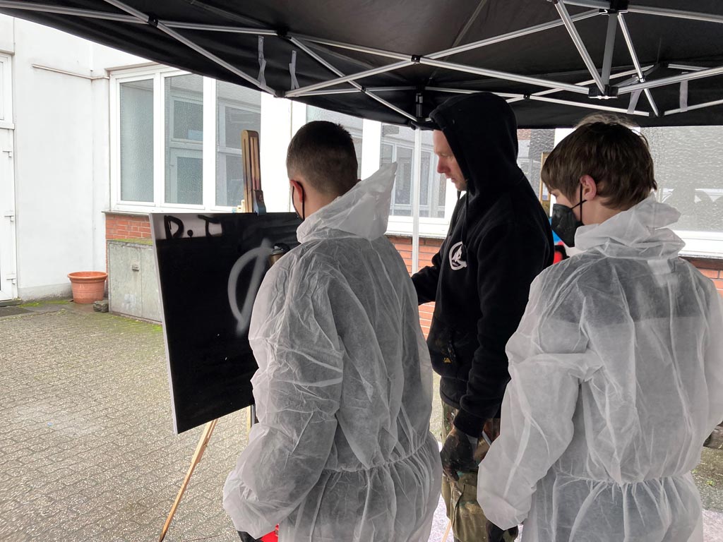 Vorab wurde das Thema Streetart und Graffiti (Kunst vs. Kriminalität) mit den Kindern und Jugendlichen in den Wohngruppen thematisiert. Anschließend konnten die TeilnehmerInnen dann unter der kompetenten Begleitung und Anleitung der Workshop-Leitung, den Umgang mit der Spraydose gezeigt bekommen und verschiedene Techniken ausprobieren.